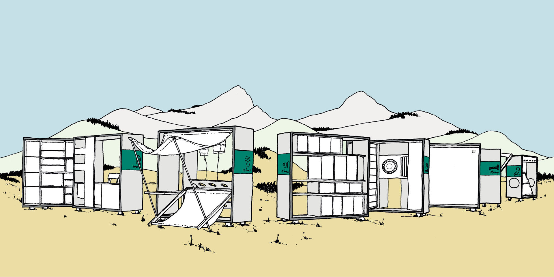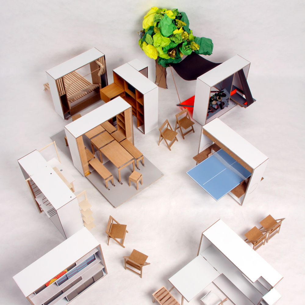 Derzeit besteht es aus acht einzelnen Elementen, welche individuelle Funktionen verbergen, die sich nach und nach entfalten. Es entsteht ein variabler Lebensraum. Er lädt dazu ein, kreativ mit der persönlichen Umgebung zu interagieren, seine Wohnlandschaft immer wieder neu zu gestalten. Die Rahmen lassen sich