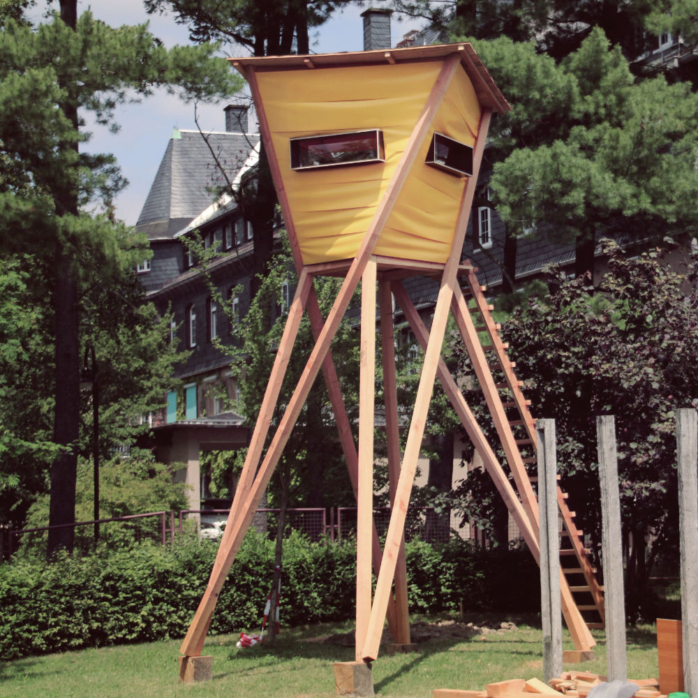 Die Konstruktion besteht aus verschraubten Douglasienbalken. Tür sowie Fenster sind aus robuster Siebdruckplatte, der Sichtschutz aus gelber LKW Plane hergestellt. Die gelbe Farbe schreckt das Wild keineswegs ab, sondern wird, ähnlich wie grün und braun, als natürliche Farbe von den Tieren wahrgenommen.