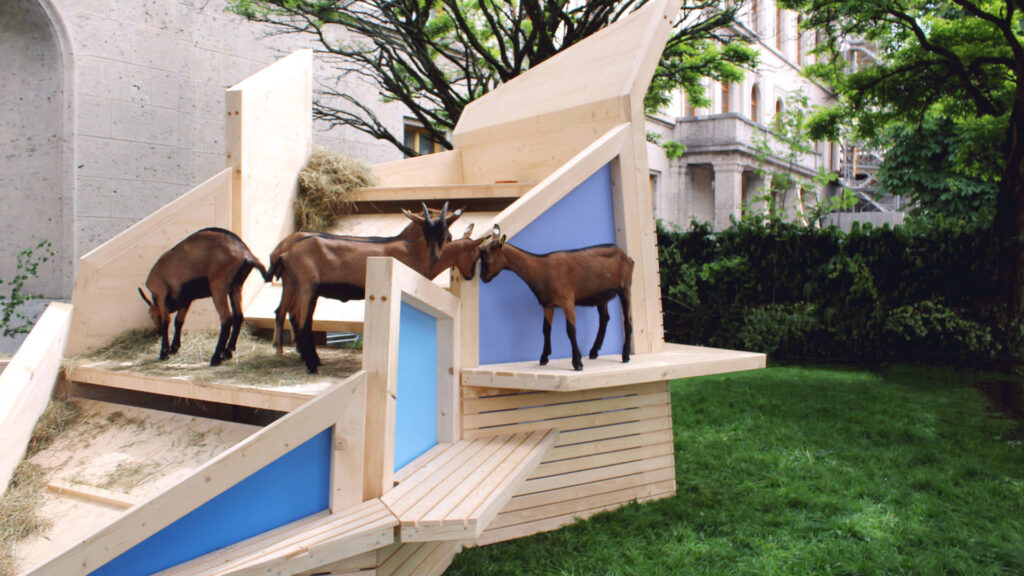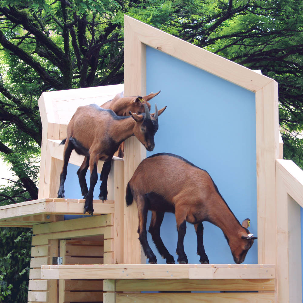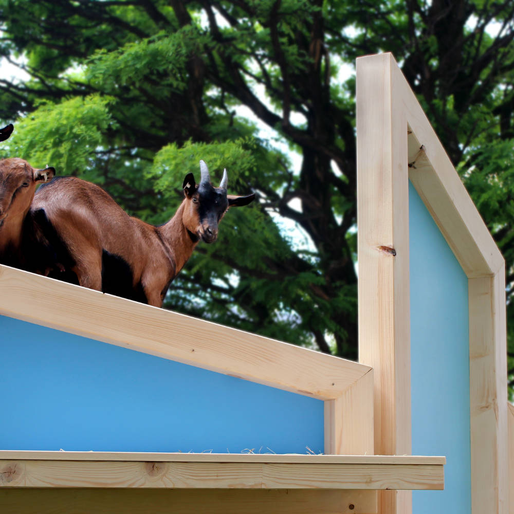 Podeste und das Dach des Stalles sind in verschiedene Ebenen geteilt, wodurch sich verschiedene Nutzungsmöglichkeiten ergeben. Die Ziegen können die Aussicht