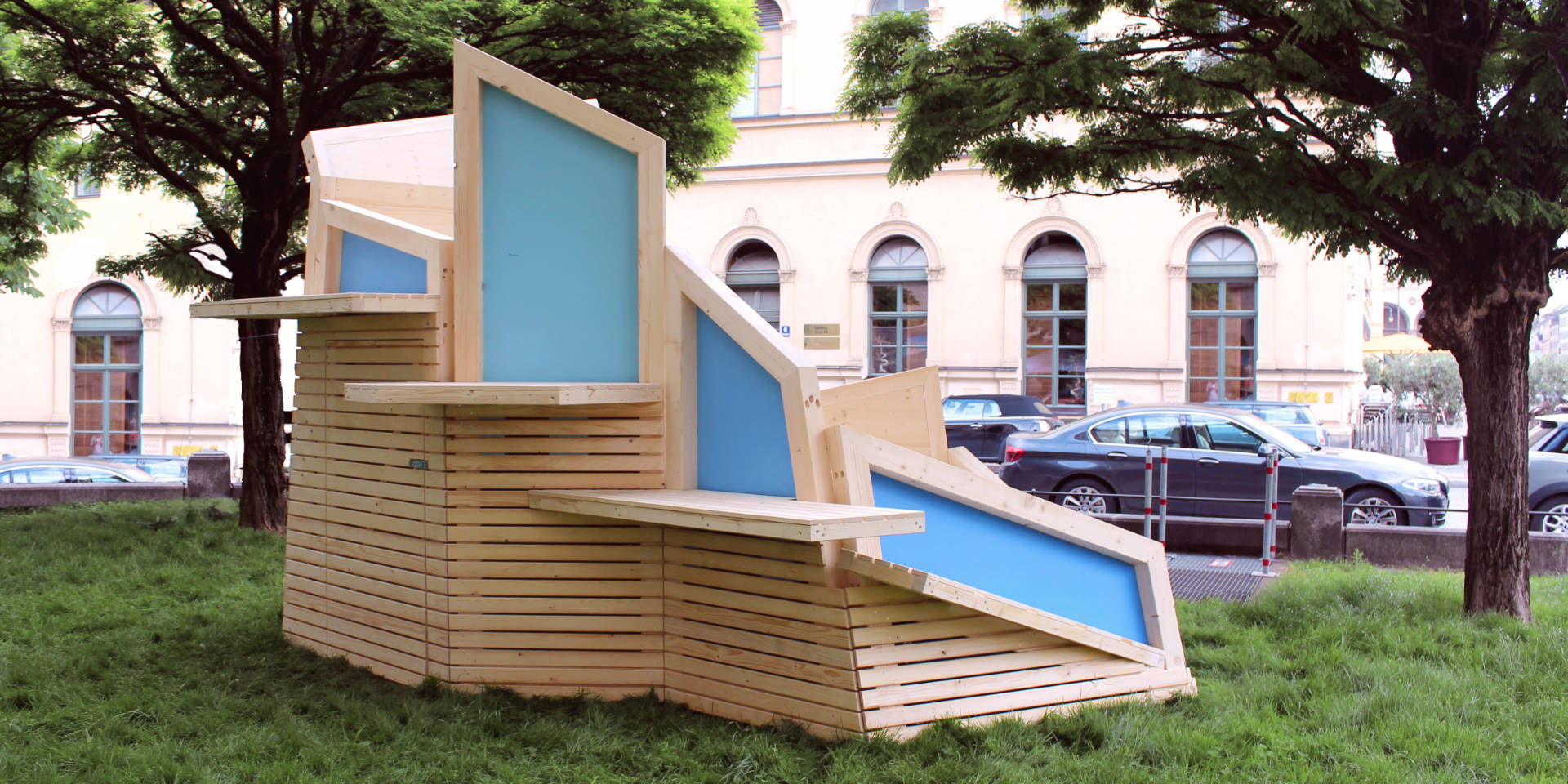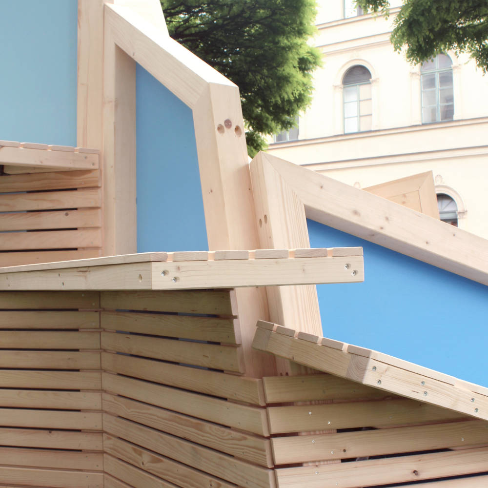 Unterkunft und Kletterspaß. Das Bauwerk besteht teils aus farbige Flächen. Die verwendeten Blautöne stehen im Komplementärkontrast zu den Brauntönen des